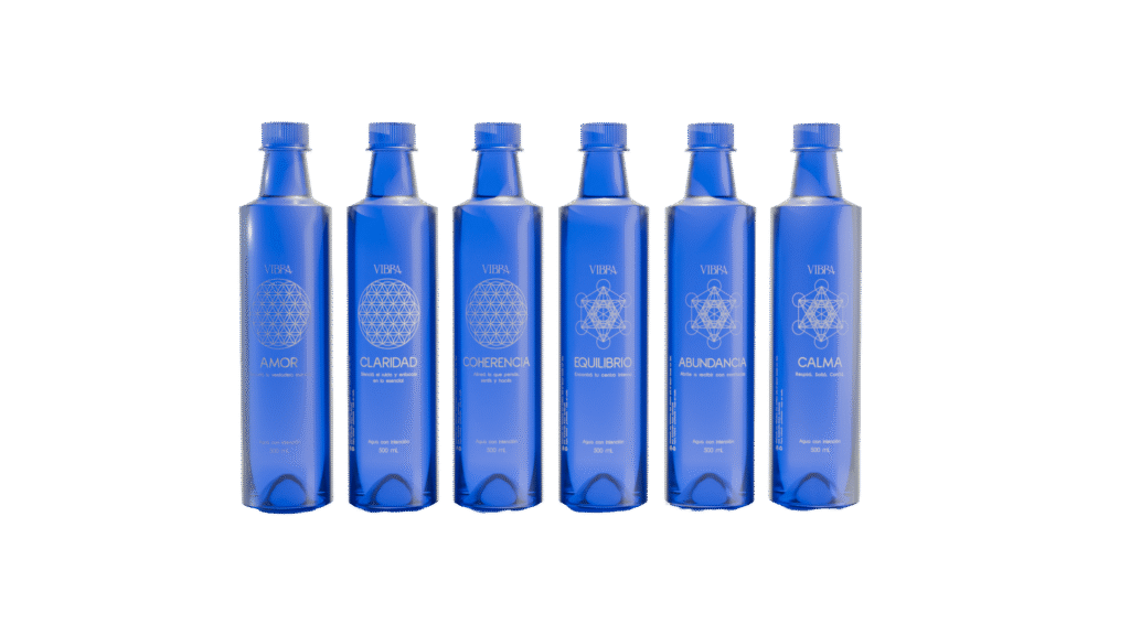 Es una experiencia de intención cotidiana. Cada botella combina palabras de alta frecuencia y geometría sagrada, funcionando como recordatorios simples para volver a tu eje y habitar el día con mayor coherencia.
